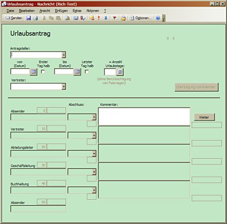 Dazu dient dieses angepasste Email-Formular in Microsoft Outlook (2003). Es wird global veröffentlicht, so dass es jeder aufrufen kann.