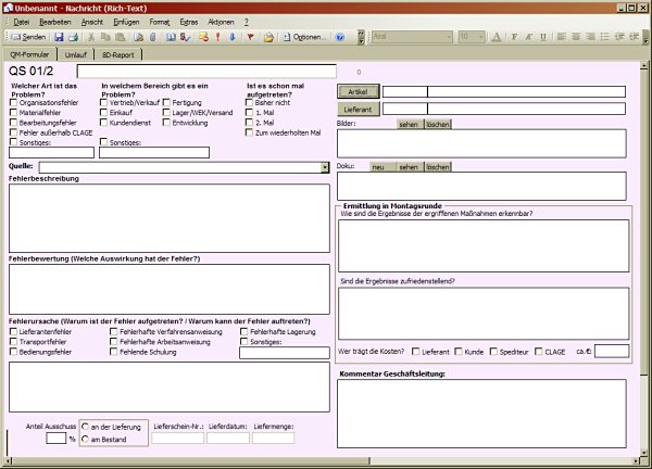 Diese Email-Formular hat mehrere Seiten. Es handelt sich um die Meldung eines Missstandes im Rahmen des Qualitätsmanagements im Produktionsablauf.