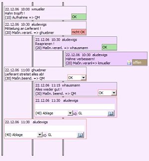 Hier gibt es keine feste Vorgabe, nach wieviel Schritten der Vorgang beendet ist. Es wird bei der Neuanlage eines solchen Ablaufs ein einzelnes dieser Rechtecke angeboten, in dem der nächste Empfänger und ein Hinweistext untergebracht werden. Der Empfänger sieht dann ein 2. Rechteck und muss den Status des vorherigen Schrittes festlegen ("erledigt", "nicht ok",..).